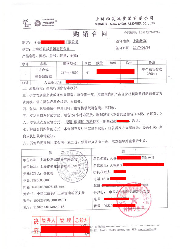 上海松夏減震器有限公司官方網(wǎng)站為您介紹:【無錫萬科魅力一期商業(yè)街項目】ZTF型彈簧減震器產(chǎn)品采購合同信息,我們松夏公司2019年為茶旅小鎮(zhèn)(武夷山)會展中心-配套ZTF型彈簧減震器,起到了減震和降噪的作用,以下是【無錫萬科魅力一期商業(yè)街項目】ZTF型彈簧減震器產(chǎn)品采購合同介紹。
